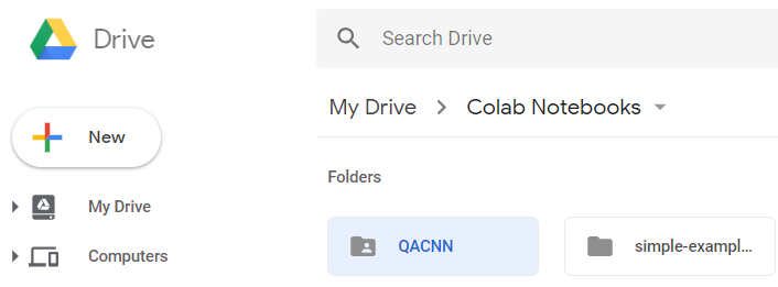 先跟瑩婷或宗諭拿完整的 QACNN 資料夾 (除了原本的 repository 外,還需要 output_data 內的檔案)。將此 QACNN 檔案上傳到 google drive 的根目錄。後續會將此 QACNN 路徑掛載到 Colab 之下執行。
