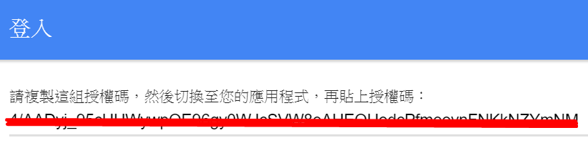 授權成功會出現以下畫面 : Please enter the verification code: Access token retrieved correctly