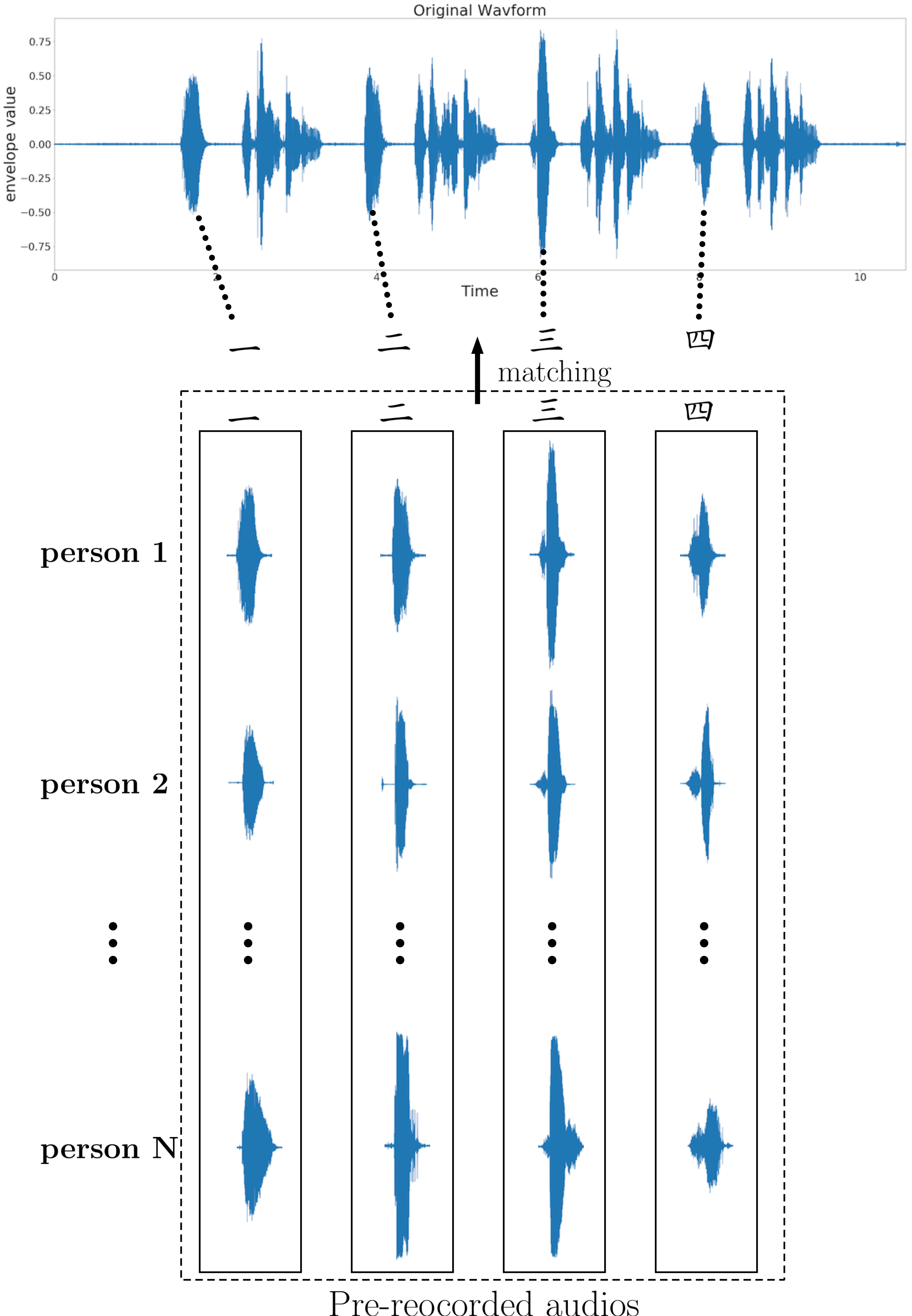我們的作法是預先取得N個person說"一"、"二"、"三"、"四"的音頻。當一個新的選項音頻輸入時,用DTW計算音頻跟我們預錄"一"、"二"、"三"、"四"的相似度,選擇最相似的person。DTW除了計算相似度之外,也會計算音頻裡面最相似的片段。在圖一的範例音頻裡,經過匹配之後,得出最有可能是person1。