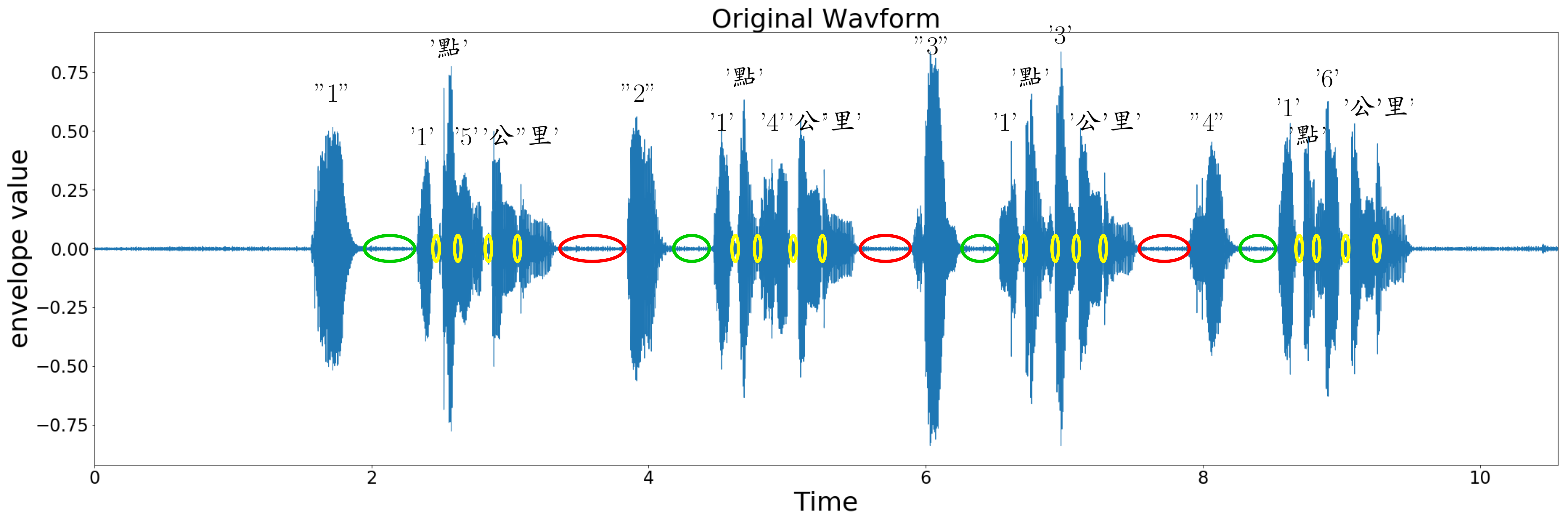 圖二(黃)圈inter-syllable(word) silence(字元間的安靜區域),inter-syllable silence通常都是一個很小的值(<100ms)。